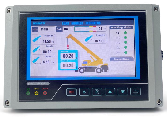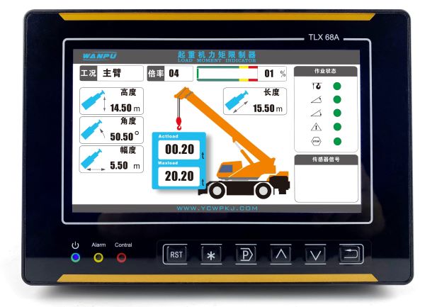 顯示:實時顯示額定起重量、實際起重量、吊臂長度、吊臂角度、作業(yè)幅度等。