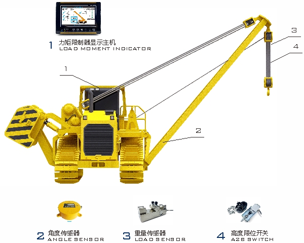 吊管機力矩限制器主要由力矩限制器顯示器、角度傳感器、重量傳感器、高度限位開關(guān)等組成。通過各傳感器檢測信號,可以實時在顯示器上顯示起重機的額定起重量、實際起重量、角度、作業(yè)幅度等信息,并根據(jù)情況輸出報警信號和控制信號,輔助作業(yè)人員安全操作起重機。