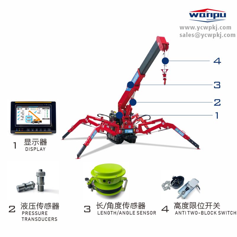 • Product description: Spider Crane Load Moment Indicator and Mini Spider Crane Moment Indicator are safety protection systems specifically designed for small cranes to prevent accidents caused by overload.